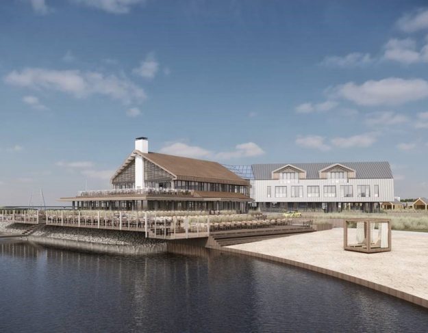 De armen ‘vangen’ het omliggende landschap en grijpen naar de horizon, de kopgevels geven uitstraling richting de verschillende windstreken en vormen vanaf het water het oriëntatiepunt.