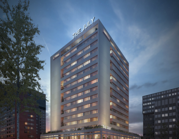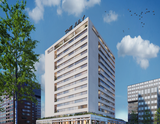 The July is geen standaard hotel, maar een appartement-hotel. Het gebouw huisvest straks ongeveer 240 comfortabele appartementen verdeeld over 14 verdiepingen, met ieder een volledig uitgeruste privékeuken. En dat mét de service en de luxe van een hotel.